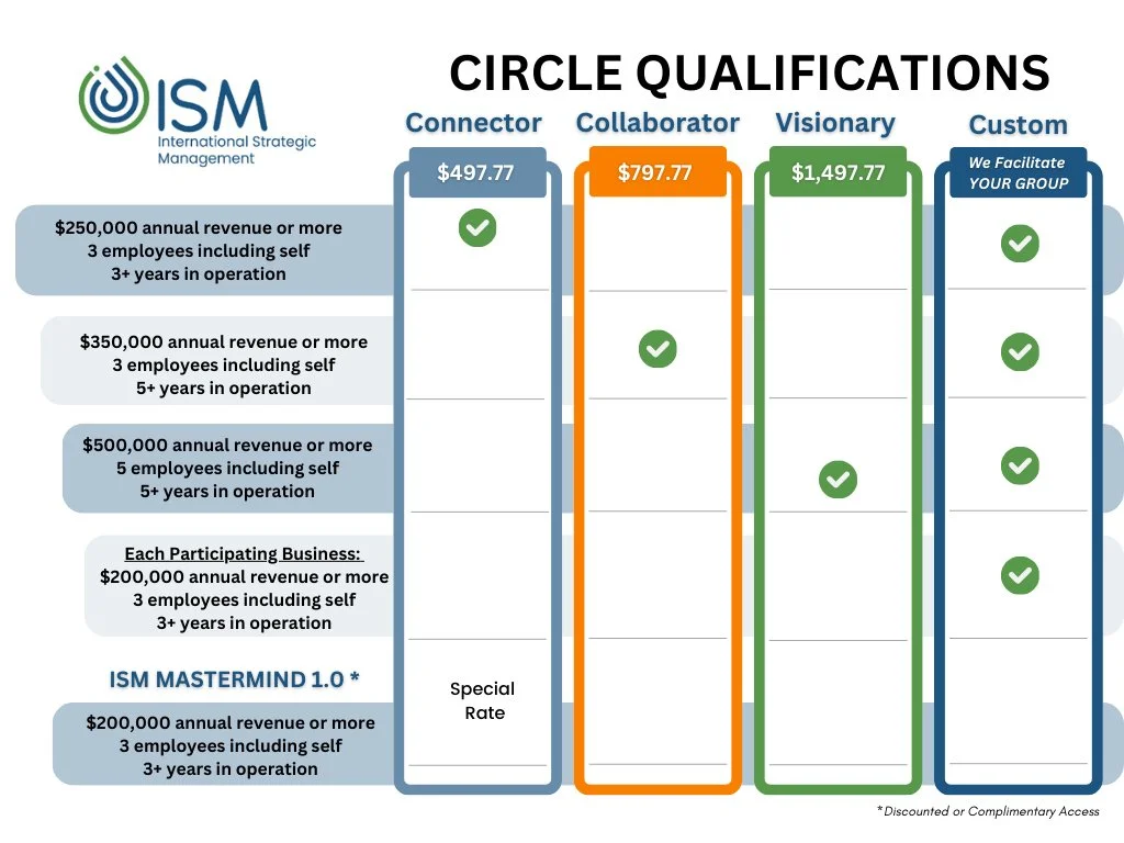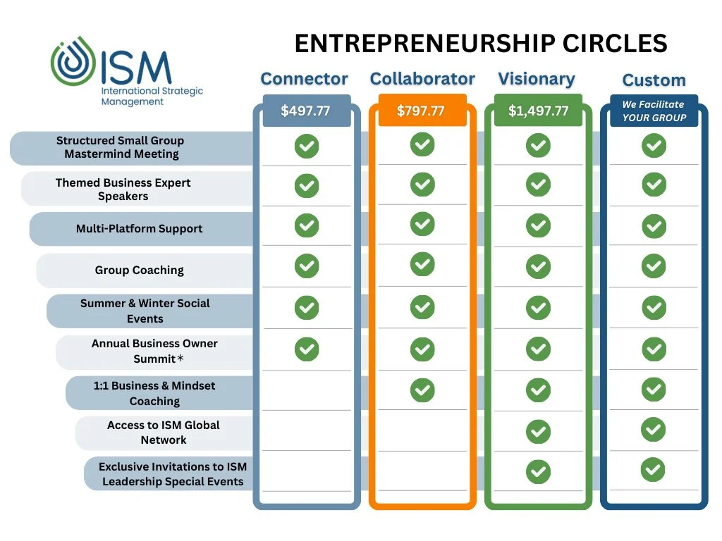 A mastermind is a small, select, qualified group of business owners who share the same business values, come from similar backgrounds or have the same goals in mind regarding resilience or growth for their business. Our ISM Masterminds are group coaching circles that allow for both open, private discussion and hot seat coaching for each participant. There is not a curriculum delivered, but specific business TOOLS are offered to support the group as needed from our extensive library of resources.